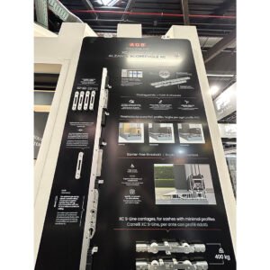 Pannelli informativi sviluppati per l’allestimento fieristico, progettati per organizzare e valorizzare le diverse aree prodotto.