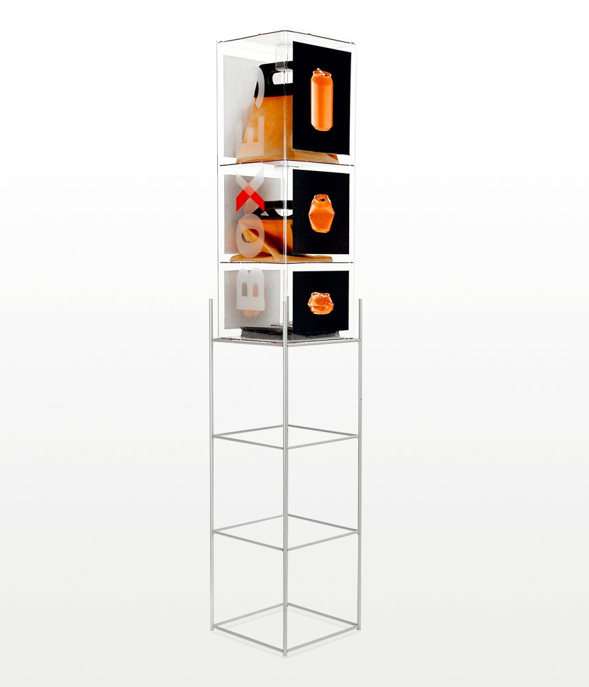 Espositore da terra realizzato per Diesel, con struttura in alluminio e ripiani in plexiglass trasparente.