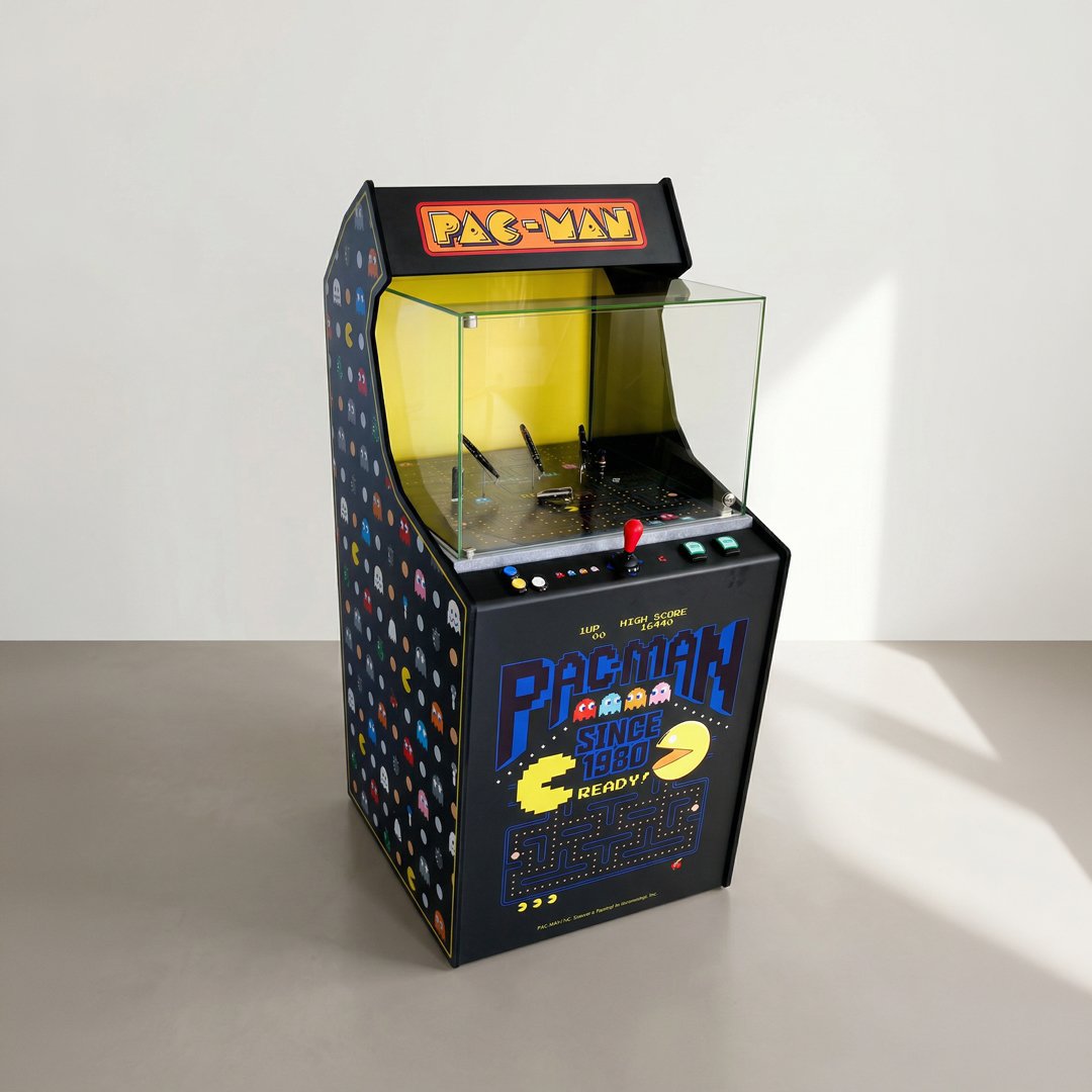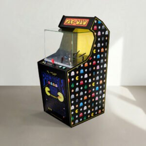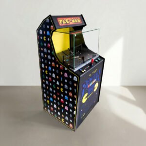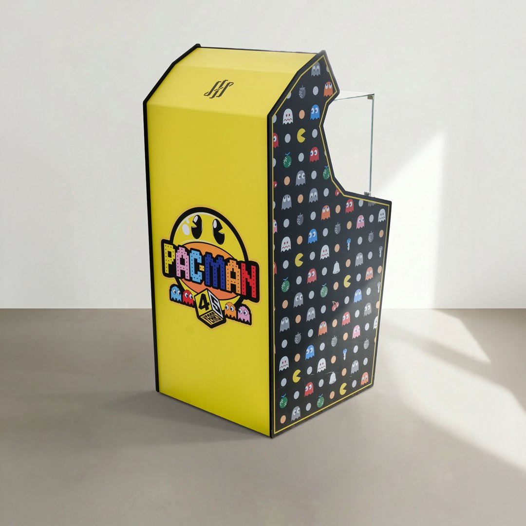 I pannelli in forex, stampato in digitale e fresato, decorano sia l’interno che l’esterno della teca che contiene i prodotti della linea, creando un ambiente espositivo che richiama visivamente le classiche arcade degli anni ’80.