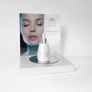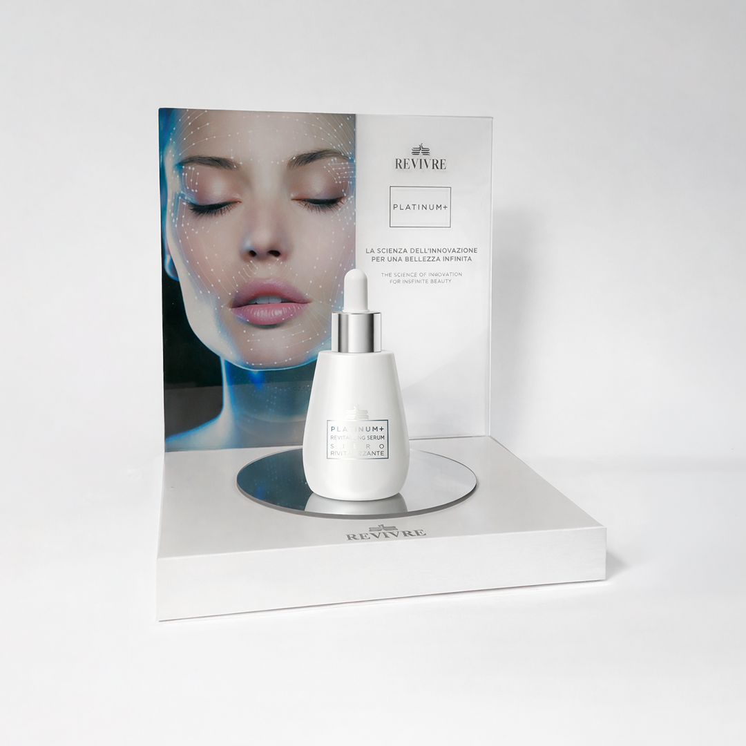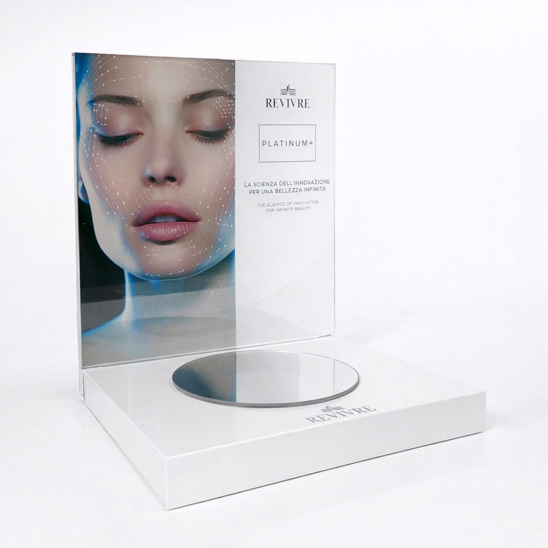 Espositore da banco sviluppato per valorizzare la nuova linea del brand Revivre, con un’estetica pulita ed elegante. La struttura è composta da base in legno laccato e alzata in plexiglass trasparente retrostampato con fondo bianco; al centro della base è inserito un disco in plexiglass specchio utile a isolare e mettere in risalto il prodotto. Una soluzione pensata per aumentare la percezione premium e migliorarne la visibilità nel punto vendita.