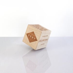 Realizzato in legno inciso a laser su tutte le superfici, senza utilizzo di inchiostri o stampe.